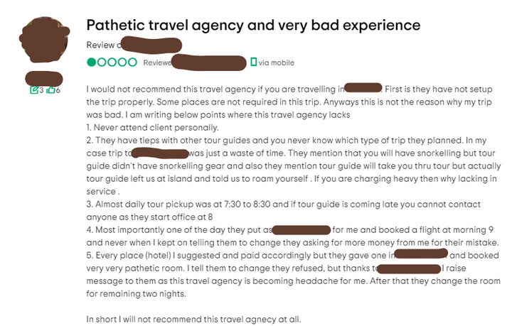 Negative comments spread across social media and reviews that will second-guess other travellers to book from them.
